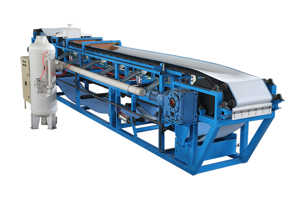 當(dāng)真空室接通真空系統(tǒng)時(shí),在膠帶上形真空抽濾區(qū),濾液穿過濾布經(jīng)膠帶上的橫溝槽匯總并由小孔進(jìn)入真空室,固體顆料被截留在濾布上形成濾餅。進(jìn)入真空室的液體經(jīng)汽水分離器排出,隨著像膠帶的移動(dòng),已形成的濾餅依次進(jìn)入濾餅洗滌區(qū)及吸干區(qū),最后濾布與膠帶分開,在卸料輥處將濾餅卸出。卸除濾餅的濾布經(jīng)清洗后獲得再生,再經(jīng)過一組支承輥和糾偏裝置后重新進(jìn)入過濾區(qū),開始進(jìn)入新一循環(huán)過濾周期。